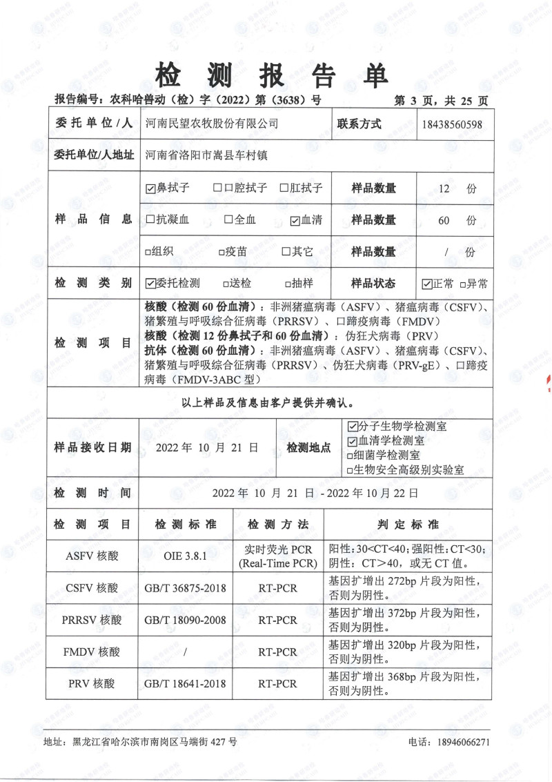 民望農(nóng)牧2022年10月份中國(guó)農(nóng)業(yè)科學(xué)院哈爾濱獸醫(yī)研究所檢測(cè)報(bào)告