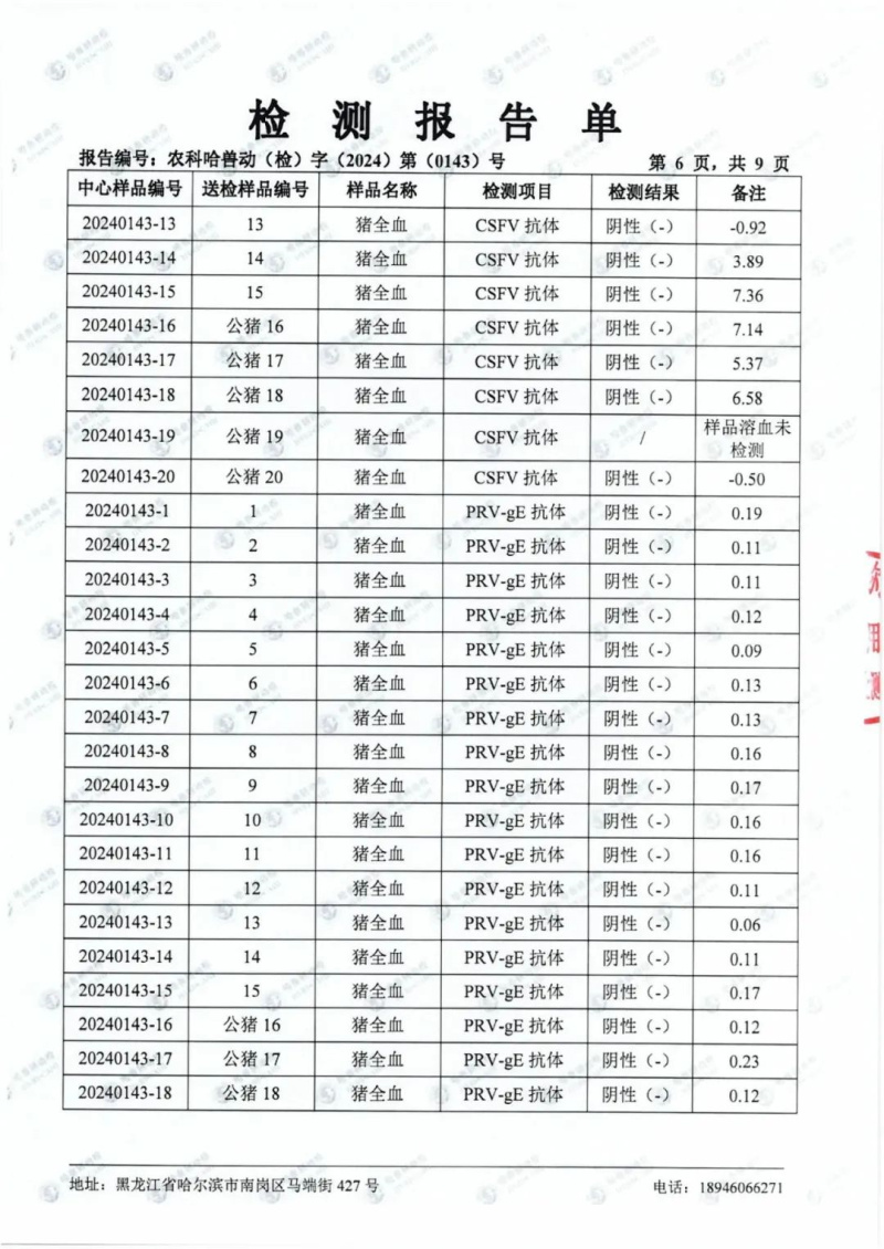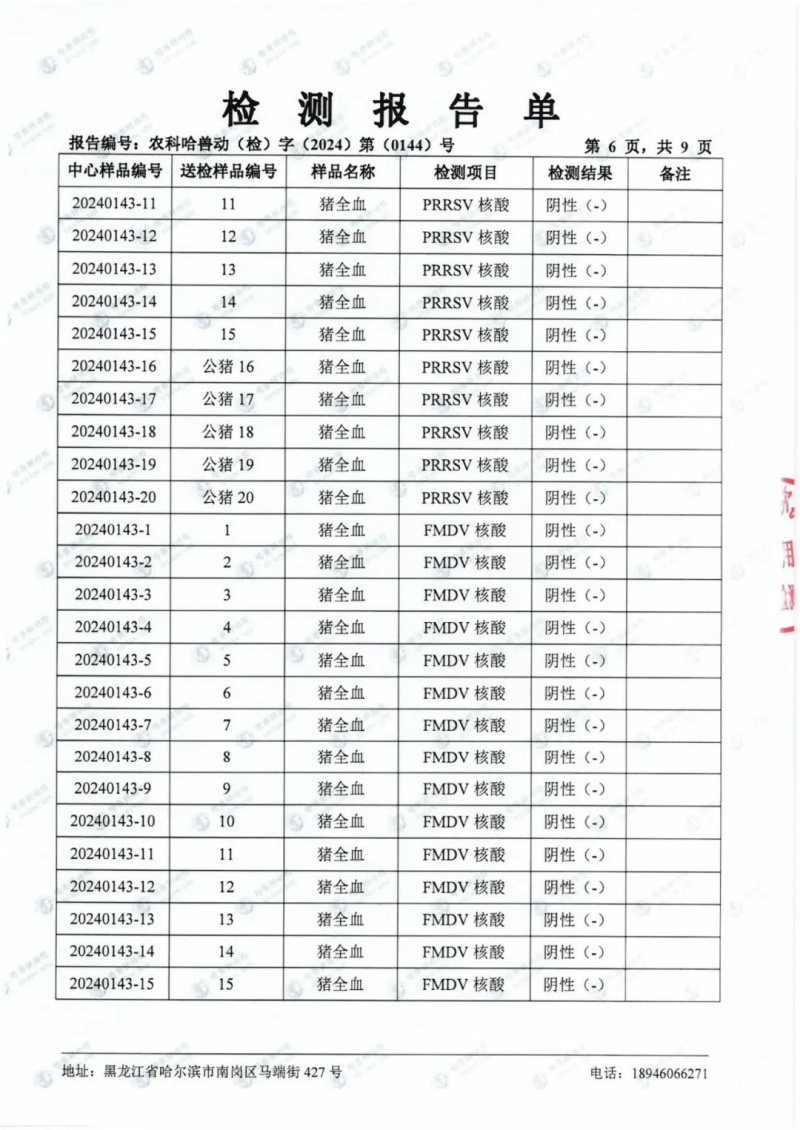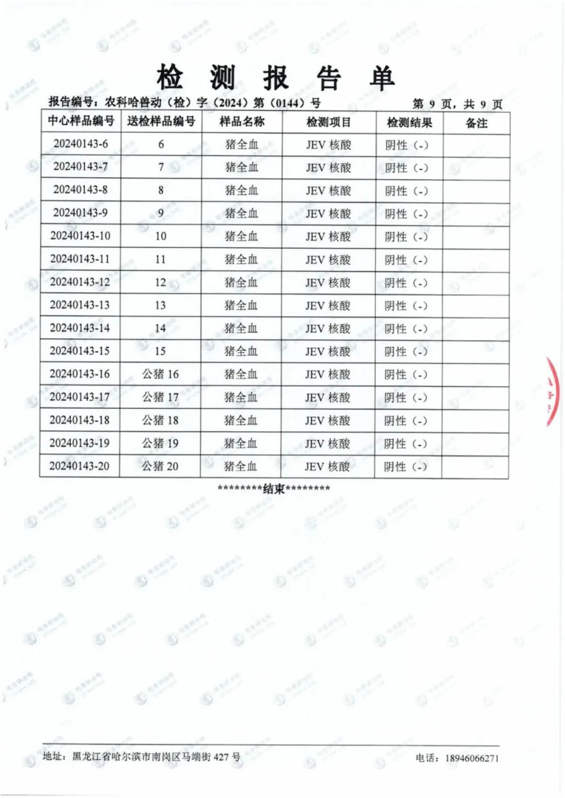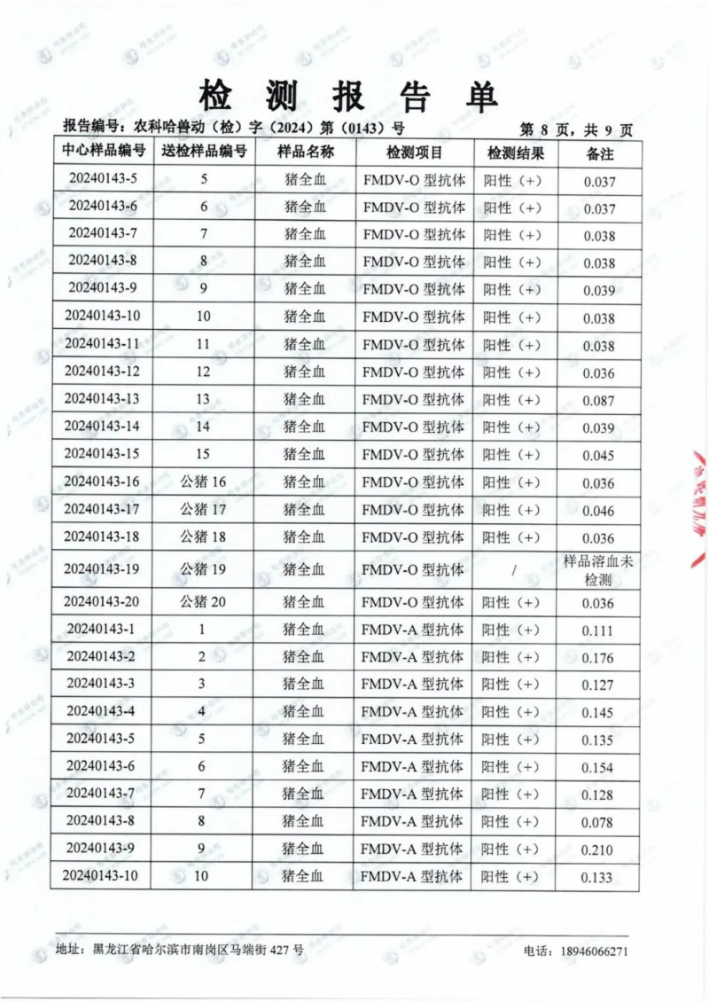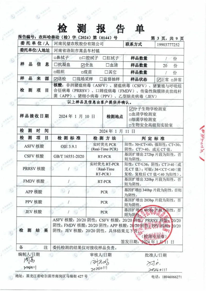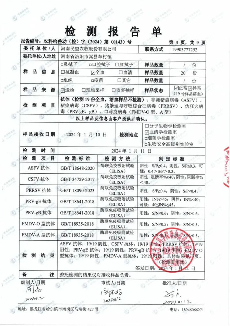 民望農(nóng)牧2024年1月份送哈獸研檢測(cè)6項(xiàng)疫病雙陰