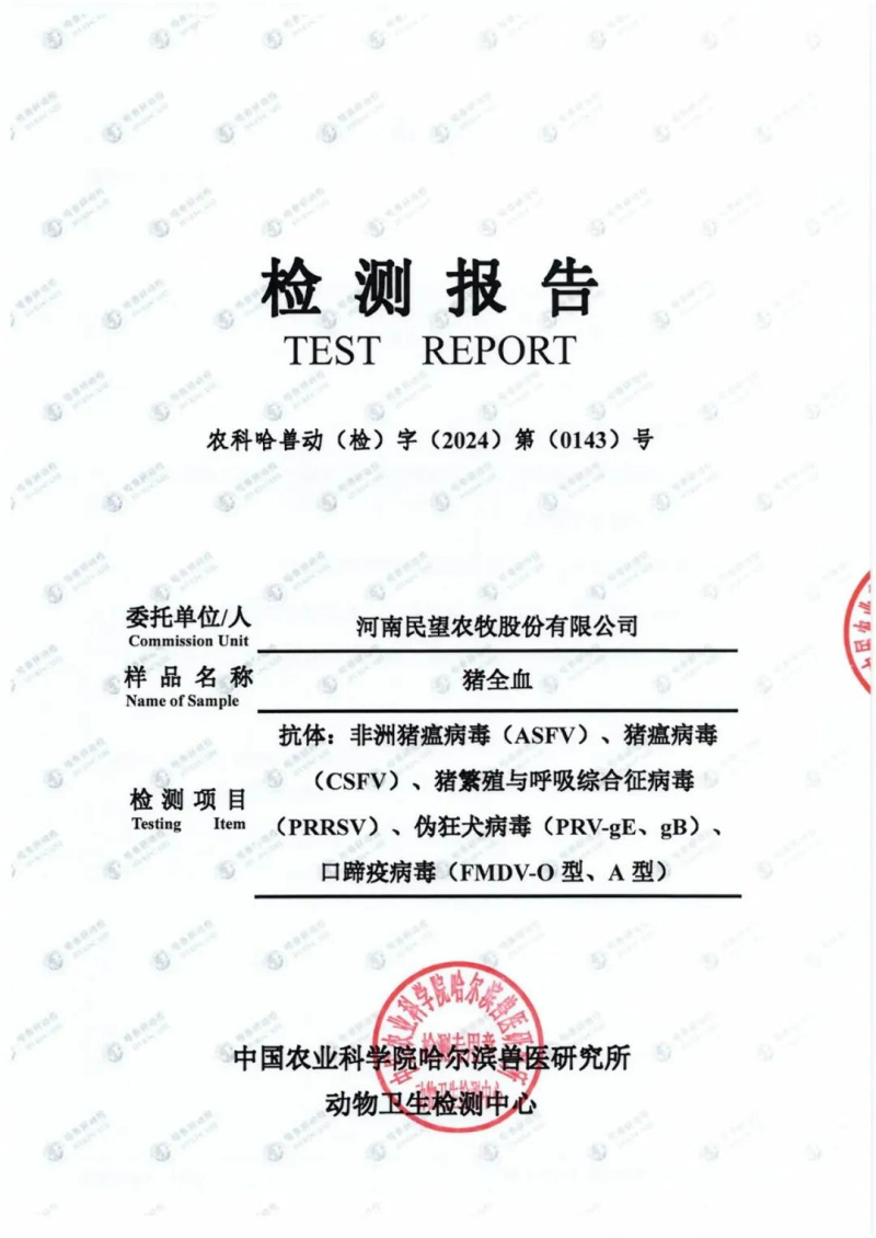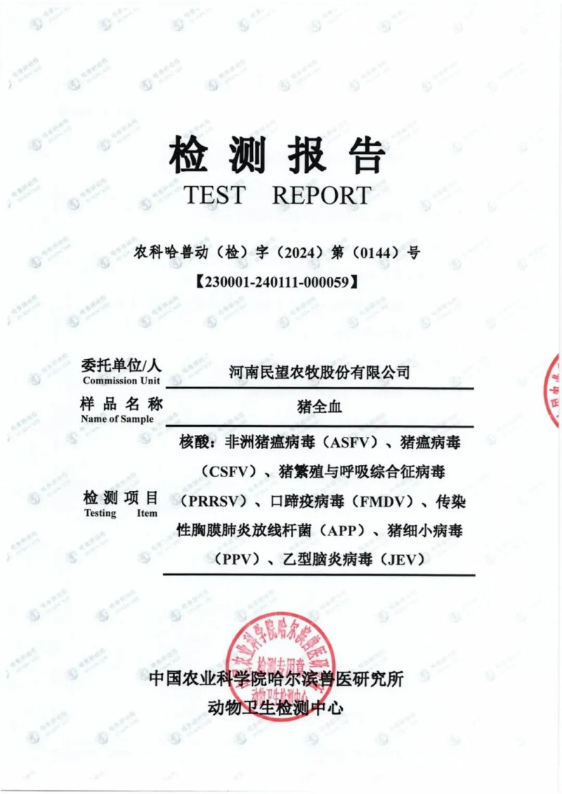 為確保各位合作伙伴引種安全,民望農(nóng)牧不僅堅(jiān)持自檢,還接受?chē)?guó)家及省市各級(jí)動(dòng)物疫病控制中心的監(jiān)督和檢測(cè),同時(shí)與哈爾濱獸醫(yī)研究所合作,對(duì)民望5A高端原種進(jìn)行更嚴(yán)格的檢測(cè),確保種豬及引種的各項(xiàng)指標(biāo)健康和安全,為合作伙伴把關(guān)生物安全,將風(fēng)險(xiǎn)降到零,是我們民望人追求的安全生產(chǎn)目標(biāo)。