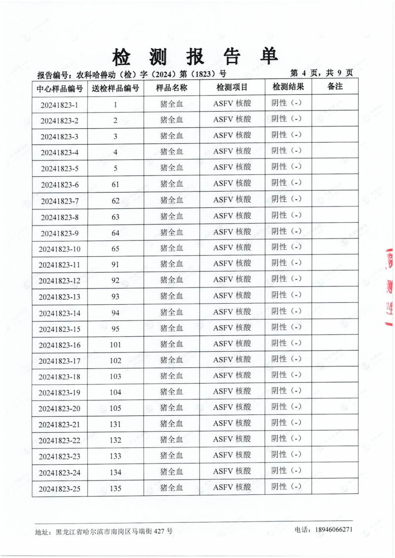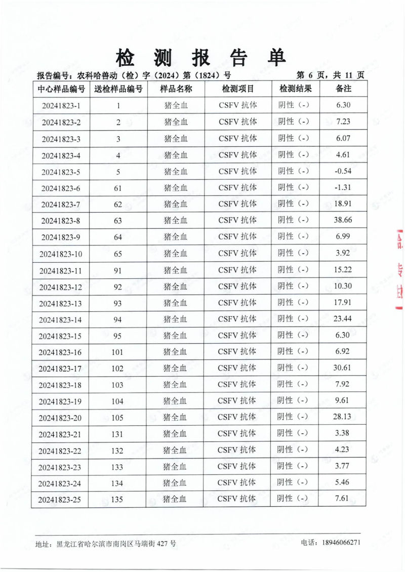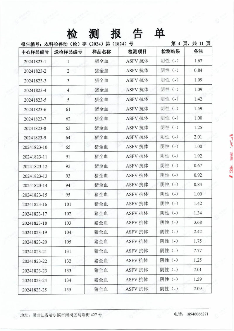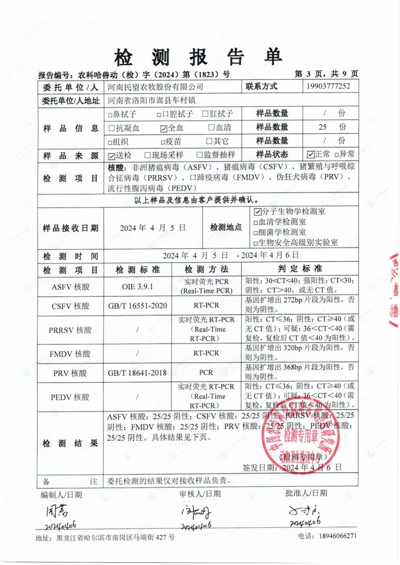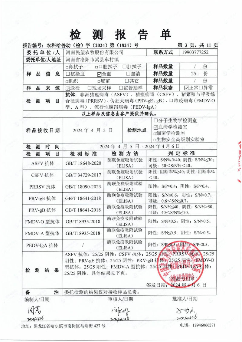 民望農牧2024年4月份送哈獸研檢測6項疫病雙陰