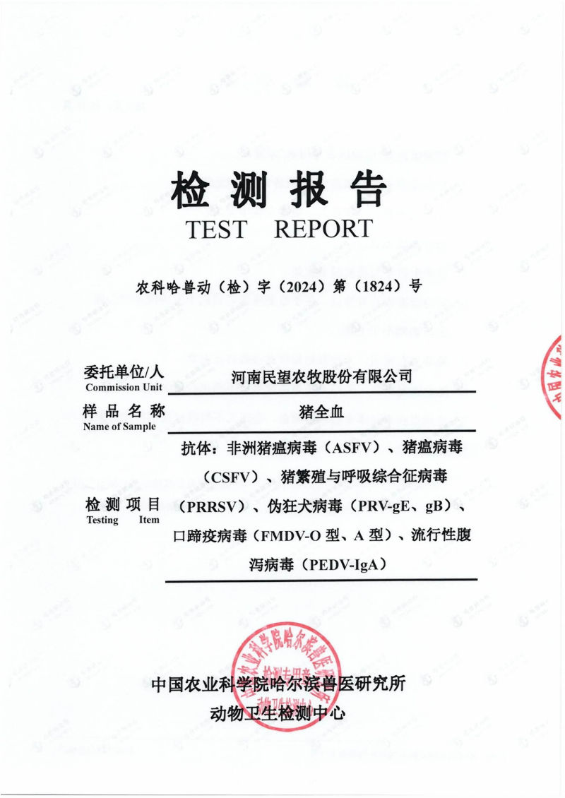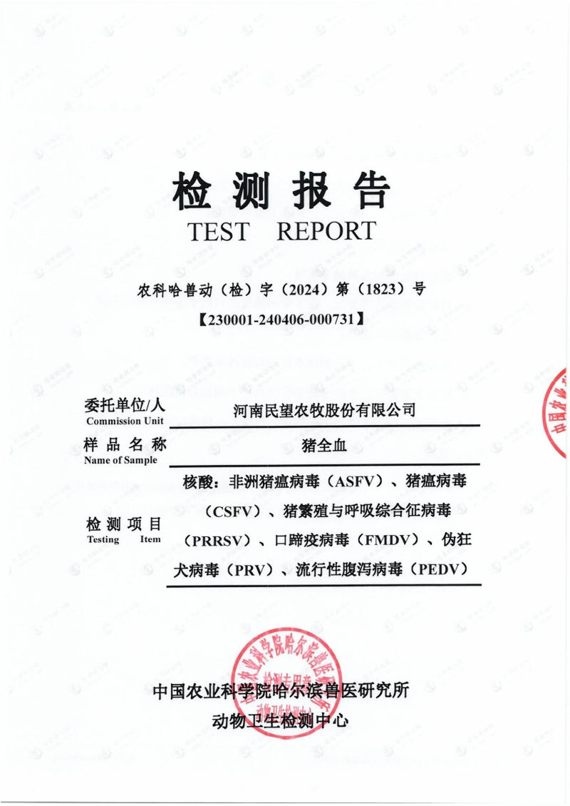 為確保各位合作伙伴引種安全,民望農牧不僅堅持自檢,同時與哈爾濱獸醫(yī)研究所合作,對民望5A高端原種進行更嚴格的檢測,確保種豬及引種的各項指標健康和安全,為合作伙伴把關生物安全,將風險降到零,是我們民望人追求的安全生產目標。